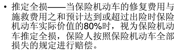 2.保險相關(guān)名詞解釋?zhuān)喝繐p失————全部損失包括實(shí)際全損和推定全損。實(shí)際全損指保險車(chē)輛全部損失或滅失;如果施救、保護費用與保險標的修理費用相加,估計已達到或超過(guò)保險金額或實(shí)際價(jià)值時(shí),即所謂推定全損,通常,使保險車(chē)輛恢復原狀所需的修理費用數額達到或超過(guò)其實(shí)際價(jià)值的四分之三以上即視為推定全損。